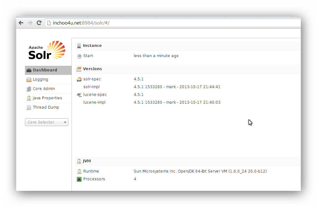 Now your Solr is started and ready for use. Default Solr port is 8983 which you can change in example/etc/jetty.xml. Look for the line <Set name=”port”><SystemProperty name=”jetty.port” default=”8983″/></Set> and change it. For this article I set port to 8984 and when I visit my URL i see my Solr running: