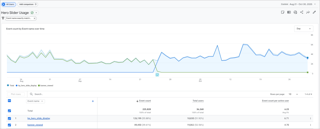 Let’s examine the collected data, comparing the old event names (banner_viewed) with the new, dedicated slider events (prefixed with hp_hero_slide), to see how interactive design principles translate into measurable results:
