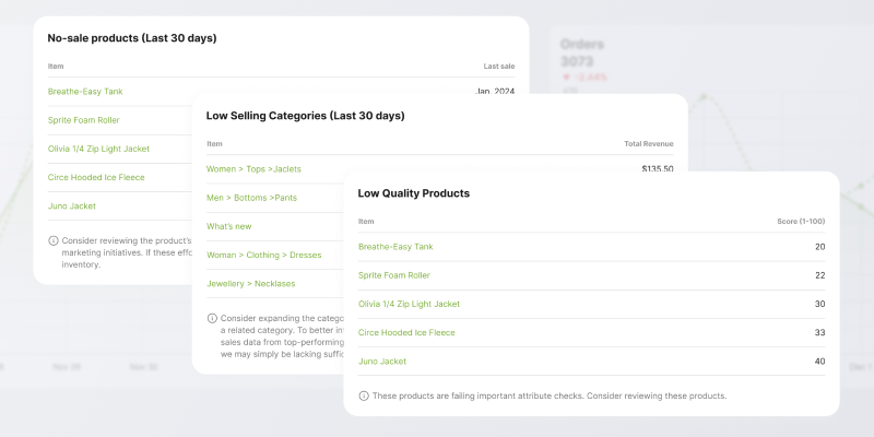 Designed to deliver more than numbers, it offers meaningful insights you might not notice on your own. It also highlights areas needing attention and suggests actions, guiding you to make improvements across your eCommerce site.